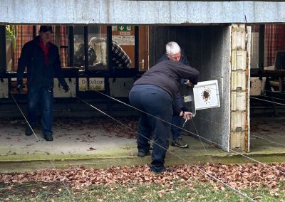 An diesem Samstag fiel der Startschuss für unser Modernisierungsprojekt mit dem tatkräftigen Einsatz vieler Mitglieder. Dabei wurde die bestehende Klein-Kaliber-Bahn fachgerecht demontiert, einschließlich der sechs elektronischen Bahnen, die für den Weiterverkauf sorgfältig abgebaut wurden. Zudem wurden Motoren, Drahtseile, Kartenschlitten sowie die Kugelfänge entfernt. Parallel dazu begannen die Vorbereitungen für die neue Elektroinstallation. In diesem Zuge wurde der obere Teil des Klein-Kaliber-Standes verkleidet und eine Verbindung zwischen der Luftgewehrbahn und der Klein-Kaliber-Bahn geschaffen.